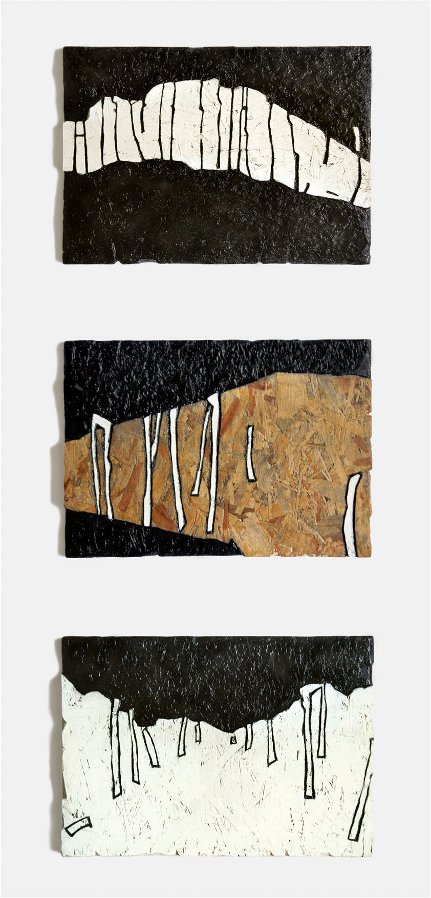 Scheinbar gänzlich abstrakt sind die Formen einer kleinen Werkgruppe auf OSB-Platten (offen und o. titel). Zunächst waren es die Strukturen des Materials, die Julia Gutkina als kompositorisches Element nutzen wollte. Doch auch hier sind der oben erwähnte Schattenwurf bzw. ein Wald Ausgangspunkte der Motive: Baumstämme und -kronen erscheinen stark abstrahiert und schwarz glänzend vor dem matten Grund. Strukturen im Material, sei es in OSB-Platten, Druckstöcken oder auch auf den Rückseiten bereits benutzter Radierplatten sind für Gutkina immer wieder Anreiz auf sie zu reagieren.